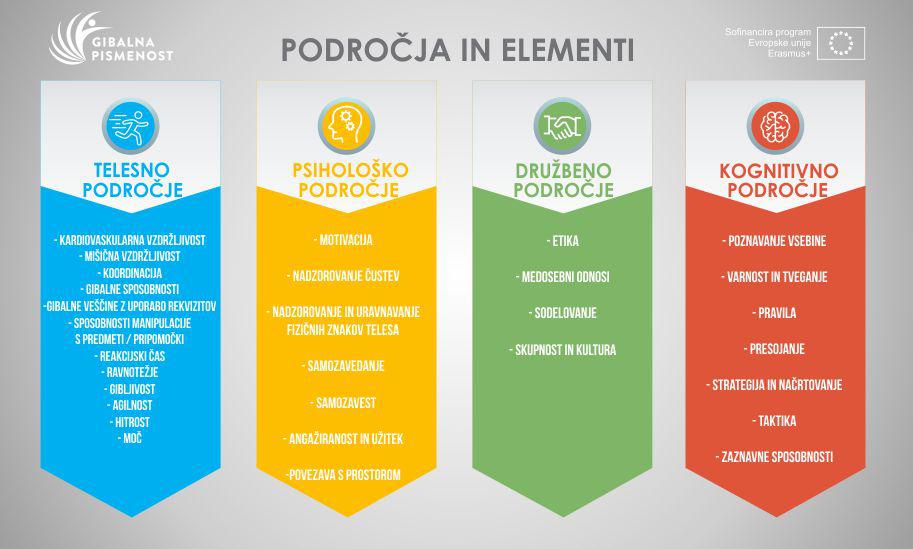 Štiri področja so zasnovana glede na številne sposobnosti, s katerimi razvijamo gibalno pismenost. Te imenujemo elementi. Vsi elementi so medsebojno povezani in jih lahko uporabljamo na različne načine za različne naloge in kontekste. Poleg tega vsak element ni ključnega pomena za vsak kontekst ali nalogo. Posameznik bo moral razmisliti, kateri elementi so pomembni za njegov lastni razvoj, da bo lahko nadaljeval z dejavnostmi, ki mu bodo pomagale razviti ali ohraniti gibalno pismenost.