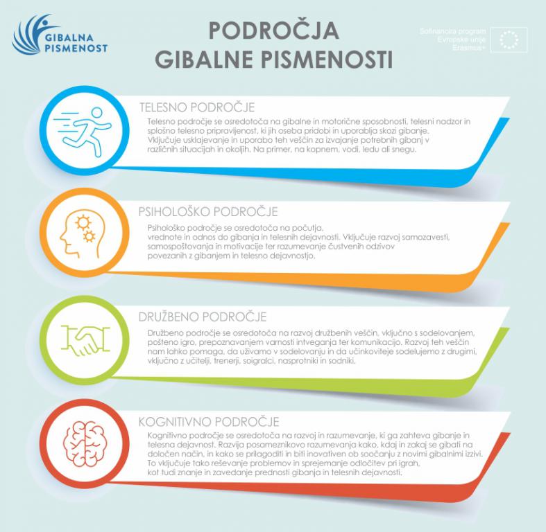 Gibalna pismenost povezuje štiri glavna področja: telesno, psihološko, družbeno in kognitivno. Vsako področje je razdeljeno na več elementov gibalne pismenosti. Pojem gibalne pismenosti k razvoju gibalnih kompetenc pristopa celovito in ne zajema zgolj motoričnih oziroma gibalnih sposobnosti.